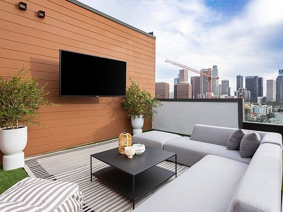 - Exterior features: Barbecue, Business Center, Catering Kitchen, Entertainment Dining Table, Euro-Style Cabinetry, Fido and Spot Friendly Living Spaces, Free Weights, Keyless Entry Systems, Matte Black Fixtures, Package Receiving, Penthouse Apartments with 11' Ceilings, Soaring 10' Ceilings, Stainless Steel Appliances, TV Lounge, View Type: Los Angeles Skyline Views