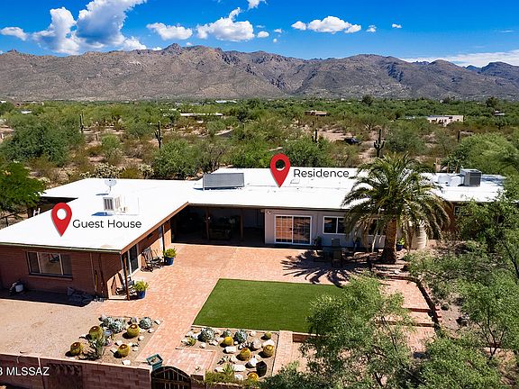 Welcome to Catalina Ranch Estates, a picturesque haven for horse enthusiasts and nature lovers. Nestled within the stunning backdrop of the Rincon and Catalina mountains. The property's location offers quick access to Mount Lemmon and Saguaro National Park allowing you to easily indulge in outdoor adventures year-round. Equine enthusiasts will be thrilled to find a meticulously designed equestrian setup, including a spacious tack room, a barn with three thoughtfully designed stalls, feed room, wash rack, misting system and two expansive arenas that are perfect for training. You'll also find Agua Caliente Wash just minutes away, ideal for riding. The property is fully fenced and offers ample space spanning over 3.4 acres with no HOA. The main house features four bedrooms, two bathrooms, and an updated kitchen with granite countertops. The guest house has one bedroom and one bathroom offering private space for visitors. Step into the beautiful courtyard ideal for entertaining and relaxation. Other features include a whole house purification system, a newer HVAC unit, a solar water heater, a 2,750-liter water harvesting tank, a four-car garage/carport, and tons of storage. Catalina Ranch Estates offers a unique opportunity to create the lifestyle you've envisioned.