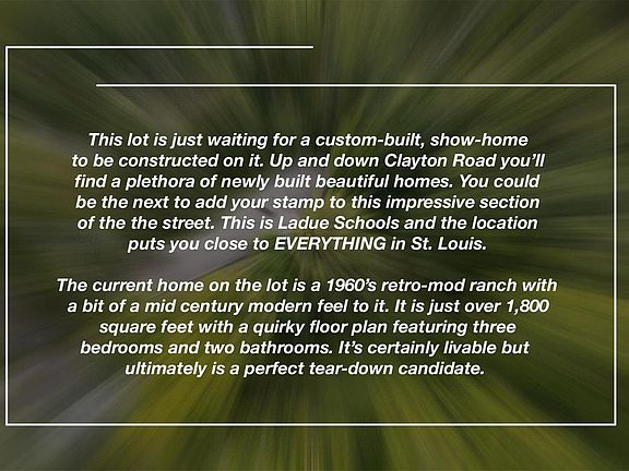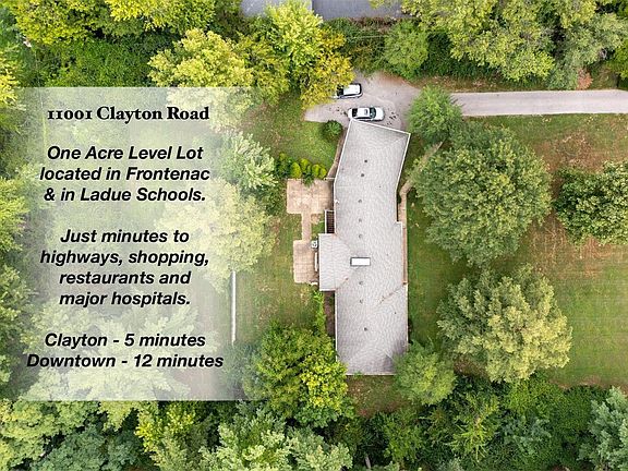 PREMIUM LOT AND BUILD OPPORTUNITY! Being sold AS-iS. Completely level at exactly one acre and should be easy to build on. Good rectangular shape too, no weird angles to deal with. Location is fantastic being close to highways, hospitals, upscale shopping, restaurants & more. Brentwood and Clayton are only about a five minute drive away, Plaza Frontenac is within walking distance and downtown St. Louis is only about a 12 minute drive. Clayton Road from here to Ballas is dotted with many custom-built, multi-million dollar homes. You can now add your stamp to this beautiful landscape. The municipality here is Frontenac and the school district is Ladue. Does not get much better than this! Currently there is a 1960’s retro-mod ranch with a bit of a mid century modern feel to it on the lot. It's just over 1,800 square feet with a quirky floor plan featuring three bedrooms and two bathrooms. It’s certainly livable but ultimately is a perfect tear-down candidate. Duplicate Listing (#23054636). Additional Rooms: Mud Room