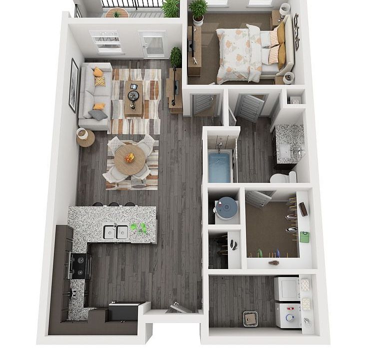 Aria's most popular 738 sq. ft. 1 bedroom/1 bath Allegro Floor Plan provides a spacious open concept luxury apartment living experience. With a gourmet bar/kitchen with granite countertops, a built in microwave, stainless appliance package and pendant lighting. Each unit comes with sleek laminate plank flooring in the kitchen, laundry and bathrooms. 9ft. ceiling with a designer ceiling fan and crown molding. This one bedroom apartment home provides functionality with its walk in closets and storage options. A perfect space to call home.