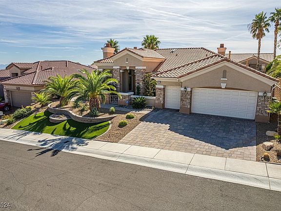 Magnificent luxury single story home resides in the uppermost section in Sun City Summerlin. This lovely, expanded Buckingham model is over 2700 sqft & has $200K plus in upgrades. From the high-end wood laminate flooring to the soaring 12' ceilings, this breathtaking beauty has everything + more. The expansive main living areas feature 2 fireplaces & gorgeous tall windows providing natural light. The kitchen features stainless steel appliances, quartz countertops, island, & cabinets galore.The tranquil primary bedroom comes complete with a retreat area with fireplace, a huge primary bath & spacious California closet. Your guests will love the second bedroom with its own private en-suite. The den incorporates an open floor space & can easily be converted to a 3rd bedroom. The sunny back room can be a 2nd office, a craft-hobby room, or a fun fitness area. Outdoor living is grand with designer landscaping with lush palms, cactus, paver stones, a spa, and your own putting green!
