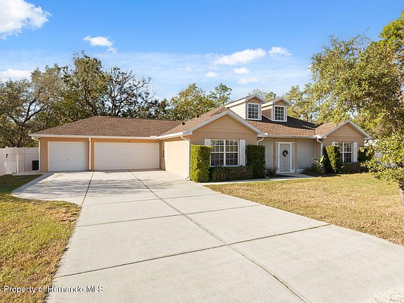 Welcome to a truly special home nestled on an oversized half-acre corner lot where space and privacy combine to create a rare offering in this desirable Weeki Wachee area. A brand-new roof, completed in August 2025, provides lasting peace of mind and adds to the home's value. As you approach, the charming gable roof and welcoming screened front porch greet you — this unique space, under the main roof and offering plenty of privacy, feels like a cozy outdoor retreat yet serves as the gracious entry into the home. Step through double French doors with matching sidelights into a luminous foyer where tile flooring stretches into a living room anchored by vaulted ceilings, large gable-windows bathing the space in natural light, and beautiful wood flooring underfoot; the living room even features two closets, adding versatile storage in an open-concept layout that flows directly into the heart of the home. The kitchen shines with stylish counters, a central island, double sink under a window looking out to the yard, and tile flooring, while the adjacent dining area offers a built-in window seat and French doors leading out to the backyard oasis. Behind the scenes just off the kitchen you'll find the convenient laundry closet. On the opposite side of the home, four spacious bedrooms provide ample room for family or guests; the primary suite boasts carpeted floors, an ensuite bathroom with dual sinks, tub/shower combo, and a walk-in closet. The second bath mirrors the tub/shower layout with a single sink. Outside, the completely fenced backyard with white PVC fencing and side gates offers a large tree-scattered yard, a small fire-pit for cozy evenings, and a concrete patio shaded by awnings over the French doors and nearby windows — a perfect setting for gardening, play, or simply enjoying Florida living. The three-car garage adds tremendous value and flexibility. And just beyond your doorstep, you're located near one of Florida's most enchanting destinations — the beloved Weeki Wachee Springs State Park — where you can watch the iconic mermaid shows and float down the crystal clear waters of the Weeki Wachee River amidst nature's splendor. This home combines elegance, room to roam, quality updates, and immediate access to one of the Sunshine State's most magical playgrounds — all in a serene corner-lot setting.
