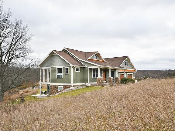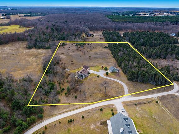 This property offers a true Homestead lifestyle on nearly 10 acres of rolling hillside and meadows. This stately four-bedroom, three-bath home features fine craftsmanship, 17' vaulted barreled wood ceilings, and an open floor plan designed for both serenity and entertaining. Enjoy multiple decks and patios, an incredible fire pit, and two outdoor showers, one attached to the main house and another at the carriage house, ideal after gardening or exploring the land. Inside, the spacious kitchen with stone and concrete counters opens to the dining and living areas, anchored by a high-efficiency gas fireplace and a charming eagles-nest loft. The main-floor primary suite includes a soaking tub and walk-in shower, along with an additional bath, mudroom, and a large heated 25x14 bonus room above the attached garage, ideal office or 4th bedroom. A geothermal system with radiant floor heat, air conditioning, generator, and gigabit fiber internet provide exceptional comfort. The walkout lower level offers a large living area, wet bar, office nook, two bedrooms, full bath, and ample storage. The detached garage includes a full carriage house/guest house with kitchen, bathroom, living and dining space, lofted sleeping area, and its own outdoor shower. Located on a quiet Kasson Township road near M-72, just a few minutes to Glen Lake School, with easy access to Glen Arbor, Empire, Maple City, Cedar, Glen Lake, and Sleeping Bear Dunes. A 19.39 acre parcel directly behind the house may also be available to future buyers.