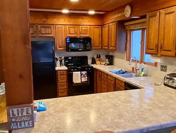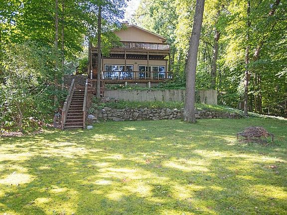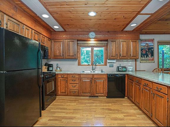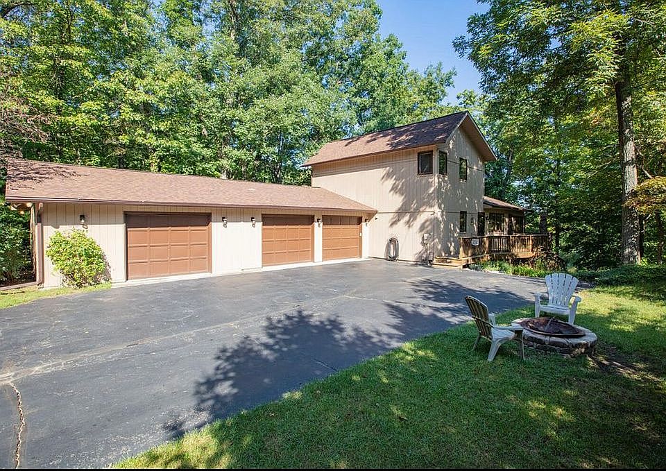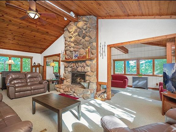 5br cabin on Corey Lake channel, first house in from lake. 3 car extra deep garage with tons of driveway parking. Multi level deck leading down to level area on the river, permanent dock for fishing and mooring your boat. Primary bedroom has en-suite bathroom, walk in closet, and decorative wood stove. Main level has laundry, kitchen, 3/4 bath, one bedroom, dining and sitting area, and living room with fireplace. Downstairs is 2 bedrooms, plus den, and full bathroom, and that leads to a lower area rec room or additional bedroom and deck. Huge home, lots of space for the family and friends. Incredible views off the deck of the woods and waterfront.