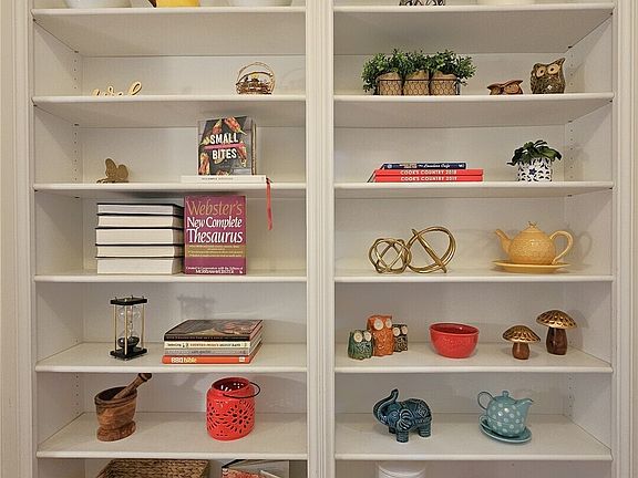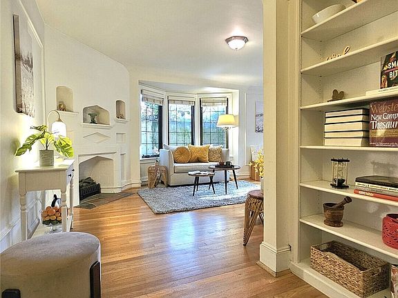 Corner decorative fireplaceCoved ceilingsBuilt-in bookshelvesWonderful year-round lightTrim detailsFriendly tree-lined street