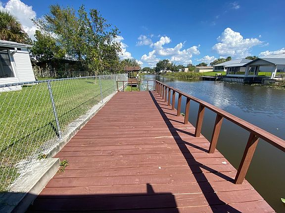 Your little slice of Paradise awaits! Look no further! Love fishing? Love boating? No problem! This property is located on a canal off Lake Okeechobee, and includes a boat dock, boat house, and boat lift, complete with water and electricity and 180' of concrete seawall The boat house and decking were recently redone. and 180' of concrete seawall will be all yours! This home sits on the VERY BEST lot in the neighborhood, on over 1/4 acre of lush green lawn, completely surrounded by a recently installed chain link fence, with a rolling double gate. It is a corner lot, located on a cul-de-sac, with water surrounding the rear AND side of the property. There is plenty of room for all your toys- kayak, canoe, RV, motor home, motorcycle, etc. The home includes 2 bedrooms, each with their own bathroom, one recently remodeled, kitchen with breakfast bar, dining room, and huge Florida room with wall to wall, wrap around windows to enjoy that spectacular view! Enjoy your morning coffee on the screened porch to enjoy the water views and balmy Florida breezes. Bonus- there is a spacious utility room attached to the home, that could be used as a workshop and for storage, with a new hot water heater and a door leading outside. The driveway is huge, and a covered carport will keep your car covered and cool. The owner has lovingly cared for this home, and recently had tie down straps installed. You will enjoy the peace and tranquility living in this home will bring. This year round or vacation home can be yours to enjoy living the Florida lifestyle! Make it your own and this will be a place you will love to call H-O-M-E!!!