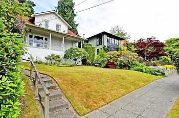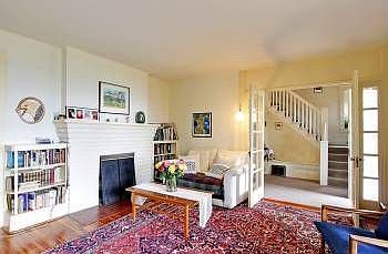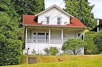 MADRONA HILLSIDE, 1906, a commanding view of a peaceful street: rife with possibilities. A banister porch, like the prow of a ship, faces east. Inside, French doors open on a warm living room with brick fireplace, fir floors, built-ins. Two bedrooms face the front; combine them in a master suiteor tear it down and build again! Back yard invites a private chat. The neighborhood's a thorough mix of handsome homes, both old and new: fixing-up is welcome, here! Local shops are blocks away.