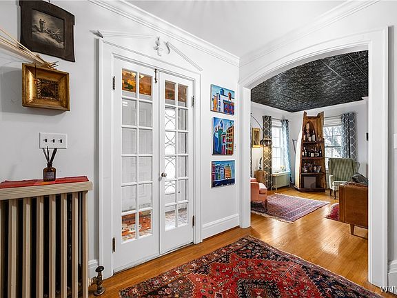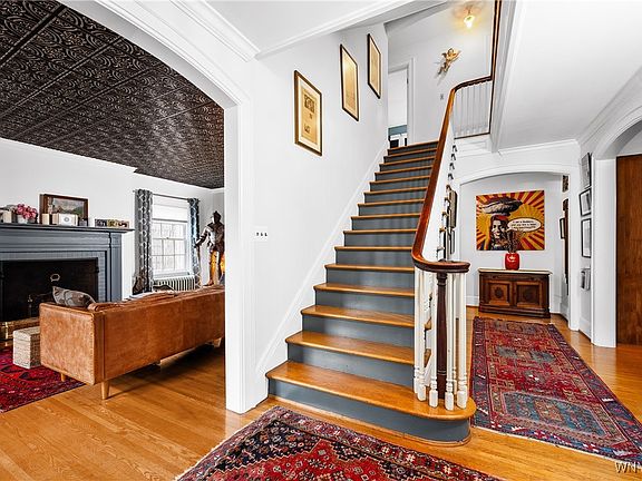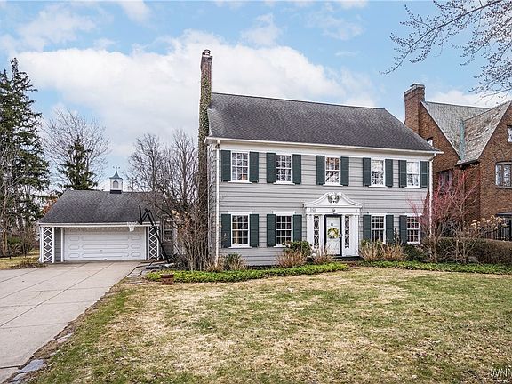 Welcome to 1101 Amherst St, a classic and inviting center entrance Colonial, with the charm and features today's buyers are searching for, just blocks from schools, shopping, restaurants, and Delaware Park. The first floor boasts an open kitchen and family room concept, with plenty of room to cook, eat, and entertain. Formal living and dining rooms with hardwood floors, plus an elegant entry, and office with french doors. Upstairs, you will find a generously sized primary bedroom, with walk-in closet and updated, en-suite full bath. 3 more spacious bedrooms, and an additional full bath with tub/shower combo on second floor. The third floor is completely finished, with a charmingly original full bath with claw foot tub, and two additional rooms ready to be put to use for an office, home gym, hang out space, or more. The 2.5 car attached garage opens to a bright and modern mudroom entry, with access to your large, private backyard with patio and hot tub (included.) Central AC added to whole house by current owners. Dry basement with loads of storage, laundry and sump pump. This is truly a special property that offers the winning combination of the best of Buffalo's historic homes, with contemporary spaces and upgrades. Offers due by 5pm, Wenedsday April 9th.