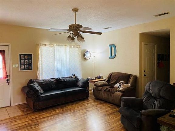Near the Bonham Lake, yet close to shopping, dining and schools. This brick, 2 BR 2 bath is a well maintained home, with wood laminate flooring and tile, roof only 2 years old, 2 car garage, storage building and covered porches. Split bedroom design, main BR has an ensuite bath and walk in closet, the other 2 bedrooms share a full bath. Utility conveniently located near main BR. Nice size living space open to the dining and kitchen area. Large backyard with plenty of space for playground, playhouse, garden and entertaining! Enjoy country living with a small community feel!