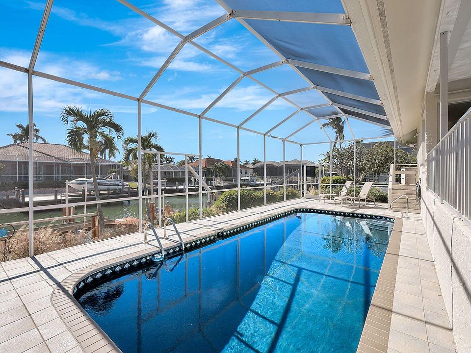 This beautifully maintained waterfront home with a sunny southern exposure is tucked away on a quiet cul-de-sac in a sought-after neighborhood. It's just a short stroll to the beach, shops, and lively entertainment spots. Some standout features include a tough 50-year roof put on in 2018, a stylishly updated kitchen and bathrooms, a newer hot water heater, and all-new appliances. Plus, most windows are hurricane-proof and all windows have hurricane shutters, along with a new garage door! The heated pool, which has been resurfaced in a lovely dark blue, not only looks great but also helps keep your heating costs down. The driveway has fresh brick pavers in both the front and back, and you'll enjoy an appealing flood insurance rate of about $1000 a year. This is a fantastic chance to own a piece of prime real estate in Marco, complete with boating access along with only 1 bridge to the gulf at an unbeatable price!