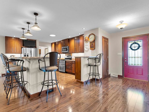 You are going to love this gorgeous custom-built home from the peaceful setting to the open floor plan, to the heated oversized 3 stall garage, it is sure to please. Upon entering the inviting front door from the spacious covered porch, you will instantly enjoy the expansive living space which encompasses a sitting room, dining space, and functional kitchen showcasing beautiful cherry cabinets and tons of counter space. Sliding glass door takes you to the newer maintenance free deck with dreamy views of lush landscaping. From the deck you may also enter the incredible private primary suite with double closets, 2 vanity sinks, a soaker tub, and a separate shower stall. Main floor laundry, a second bedroom, and full bath completes the main floor plan. The lower level offers in floor heat and provides 2 large bedrooms, a bathroom, an abundance of storage, and a wet bar with a lovely family room complete with a walk out to the stunning patio area, perfect for entertaining or absorbing nature. This gem is perfectly placed on just over 3/4 of an acre complete with a shed and fenced yard. Call today for your private tour.