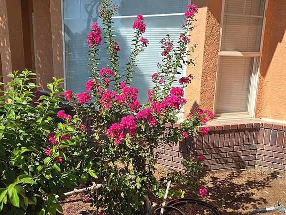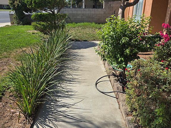 Freshly painted three bedroom with a sparkly blue pool with lush landscaping