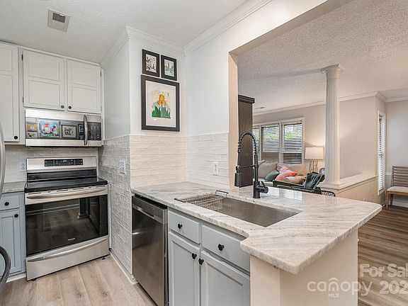 Experience urban luxury in this beautifully updated 2BR, 2BA condo in the heart of Dilworth, one of Charlotte's most sought-after neighborhoods. Recently renovated with LVP flooring throughout, this home exudes modern sophistication. Custom closets in both BR's and a queen-sized Murphy bed in the guest room maximize space & functionality. Entertain in style in the light-filled great room featuring a spacious layout & wood-burning fireplace. The gourmet kitchen boasts new designer backsplash, countertops, & appliances. Additional upgrades include a newly remodeled primary and guest bath, updated laundry room w/new washer, dryer, & cabinetry. Step onto the private, oversized covered patio to unwind amidst views of a serene courtyard & fountain. Relax at the community pool. Enjoy the ultimate urban lifestyle w/unparalleled access to trendy shops, vibrant nightlife, & trendy dining spots w/ easy access to I-77 & I-277, this condo offers the perfect blend of convenience and luxury living.