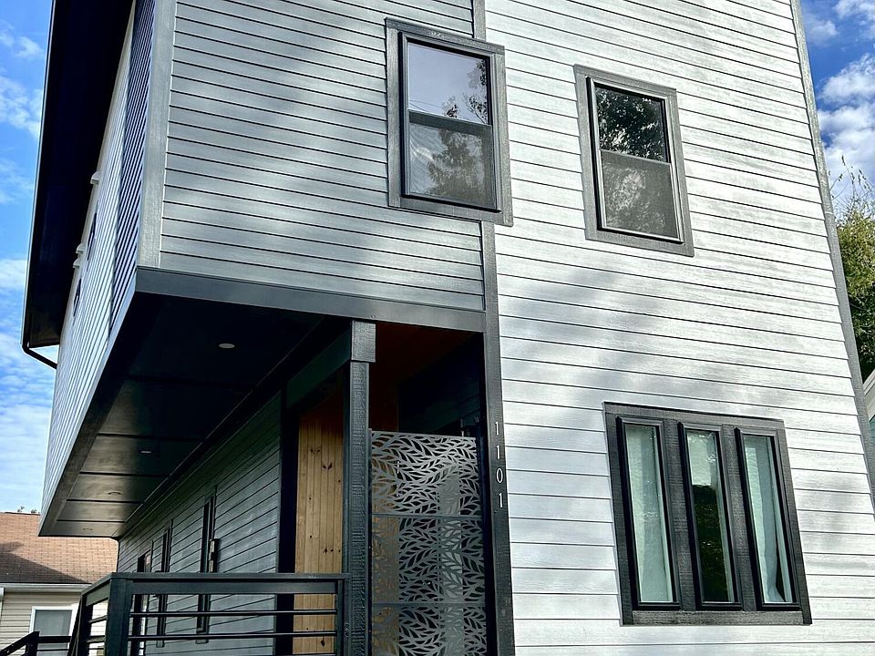 Private fenced yardModern fixturesBold two-tone paletteModern black trimHigh-end finishesCharming front porchCovered side deck
