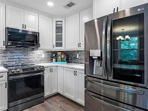 Stunning kitchen boasts all new soft close solid wood cabinetry, wide Quartz countertops, stunning tile work, new black stainless steel appliances and kick drawers!