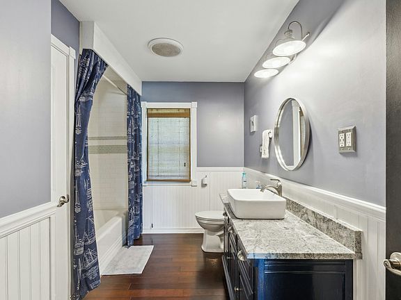 Upon entering, you are greeted by a warm and inviting interior with a cozy brick fireplace. Step inside to discover a warm and inviting living space with original hardwood floors that exude character and charm. The living room provides a bright and comforable space to relax, while the renovated eat-in kitchen is equipped with modern stainless steel appliances and plenty of storage for all your culinary needs.