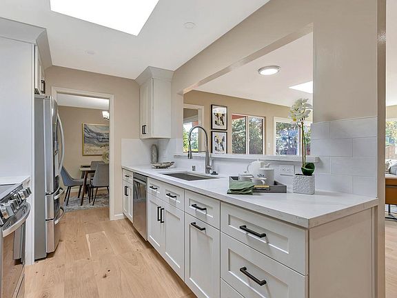 This fabulous remodeled five bedroom, two bath ranch style home is located on a corner lot in the Millbrae Meadows neighborhood. Features include a fabulous remodeled galley style kitchen w/quartz counter tops, tile backsplash, shaker cabinets, stainless steel appliances, an indoor barbecue, a breakfast bar, an adjacent breakfast nook w/sun tunnel, a family room w/ skylight, recessed lighting, recently installed beautiful hardwood floors, double pane windows, freshly painted interior, dining area, living room w/fireplace, primary bedroom suite w/mirrored closet doors and a remodeled bathroom w/tiled floors, quartz topped vanity, and shower stall, a remodeled hall bathroom with tiled floors, quartz topped vanity and a tub w/shower enclosure, nicely landscaped back yard w/deck and lawn area, landscaped front yard, an attached 2 car garage w/epoxy floors and more.