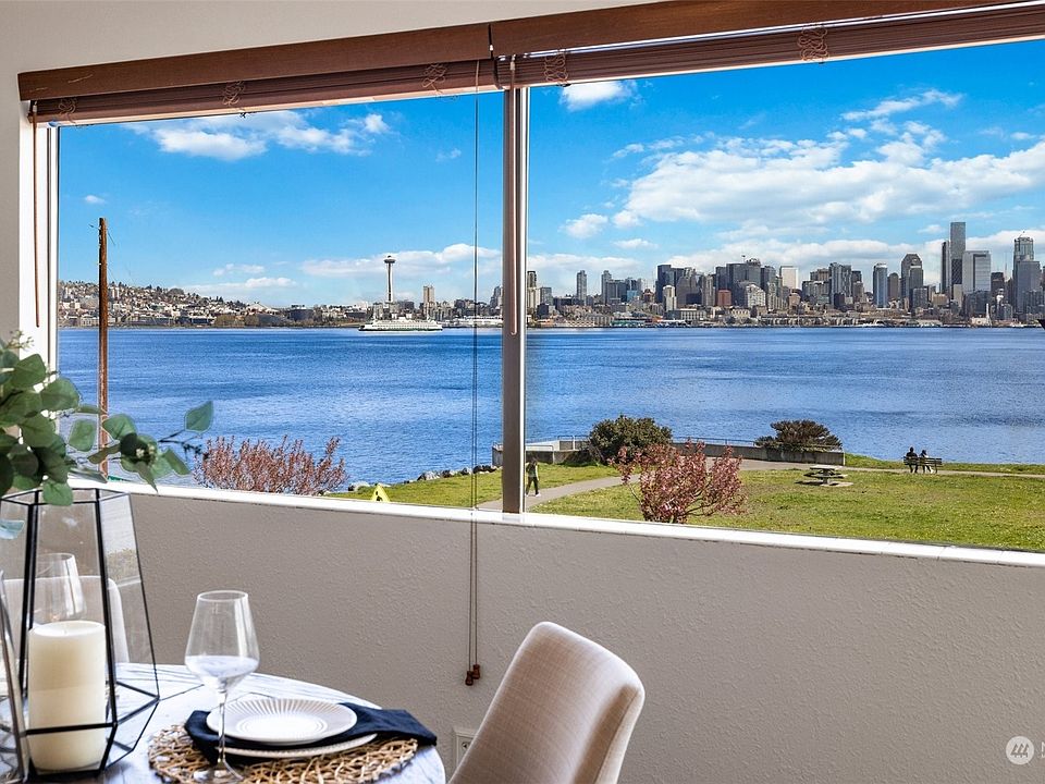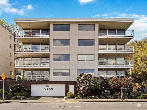 Welcome to your new home at the rarely available Alii-Kai! Revel in unobstructed panoramic views of the city, sound, and mountains from this prime corner unit. Convenient to downtown via water taxi under half a mile away. Alki Beach, brimming with shops, dining options, and idyllic sunsets is only minutes away. The self-managed and well-run HOA maintains low monthly dues at $340. Enjoy your roomy covered balcony for morning coffee and to unwind after a long day. In-unit washer/dryer, extra storage unit, and secure parking spot included! Don't miss the primary bedroom with 3/4 ensuite bath and walk-in closet. The large second bedroom makes hosting guests a breeze.
