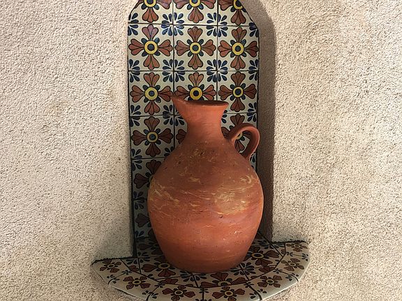 - Chef's kitchen includes handmade Talavera tile, hand glazed custom mural backsplash and premium appliances, including gas stovetop and large electric double ovens.