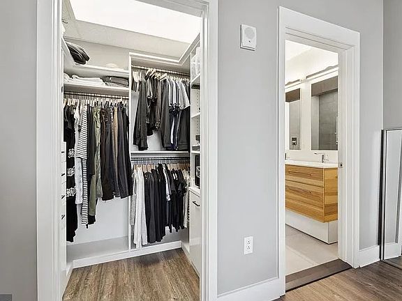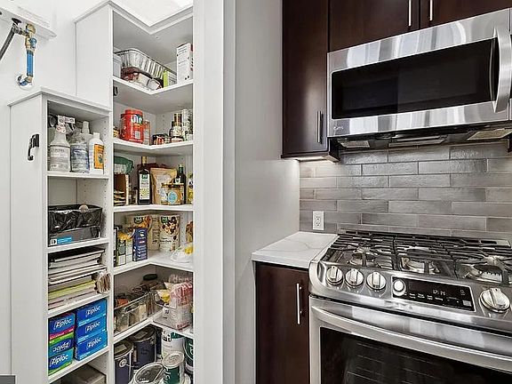 This light-filled home boasts a chef's kitchen with quartz countertops, 5-burner gas range, side-by-side fridge, and a huge kitchen island. The primary suite features a luxurious ensuite bath with double vanity, frameless shower, and a California Closets walk-in closet. The second bedroom offers flex space with a Murphy bed and built-in storage, perfect for an office, gym, or media room.