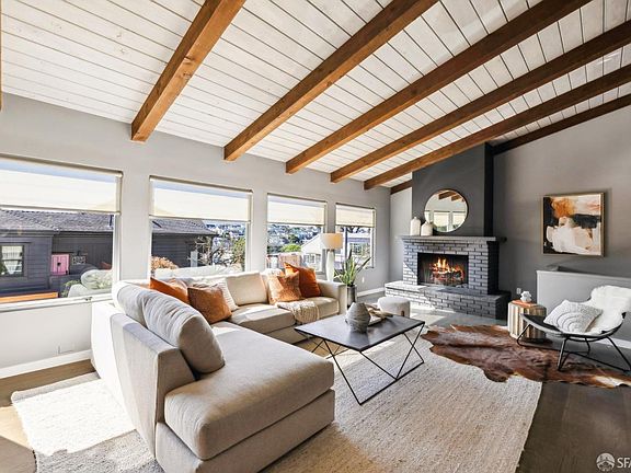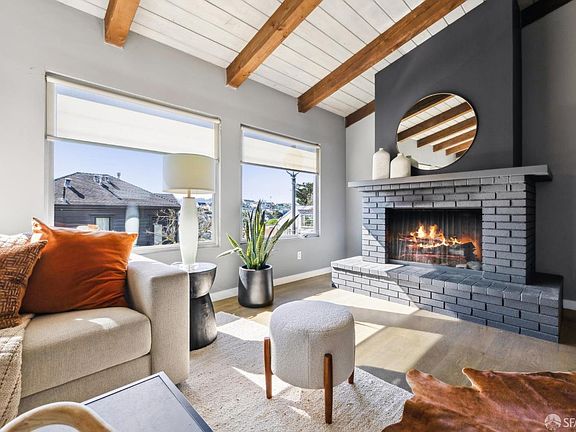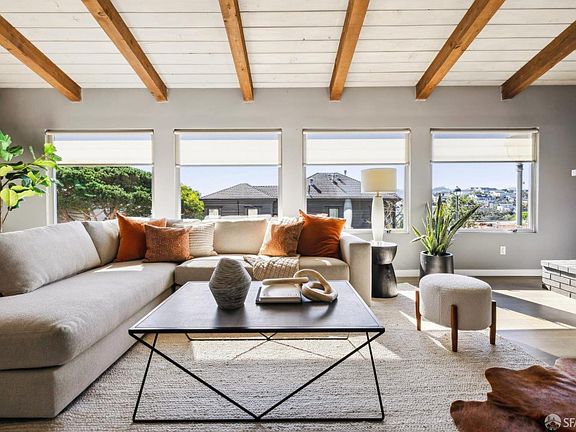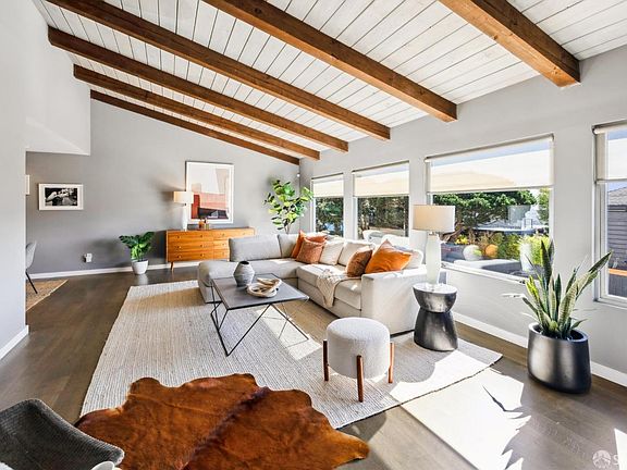 Renovated contemporary showcasing magical mid-century vibes! A stunning 3Bd/2Ba, 2 car SxS garage, modern home on a rare 45 foot wide south facing lot. Detached with windows on three sides, dramatic views of the Southern Hills, and all perched on a quiet, desirable street near the Top of Bernal Hill.