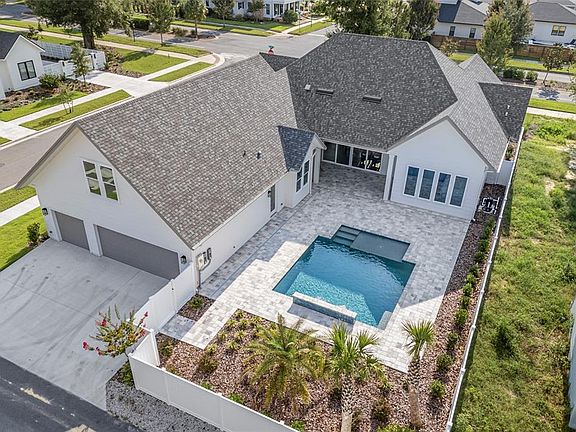 This exquisite Warring Homes 4-bedroom, 4-bathroom custom home is nestled in the award-winning, golf cart-friendly neighborhood of Town of Tioga. Showcasing a traditionally designed symmetrical exterior, this home exudes timeless elegance while offering modern conveniences. Step inside to an open floor plan that is bathed in natural light with high ceilings providing a warm and inviting atmosphere. The primary suite, conveniently located on the first floor in its own private wing, boasts a spacious dressing room, ensuring a serene retreat. Thoughtfully designed for functionality, this home includes only one bedroom and bath on the second floor, a large pantry, oversized laundry room prepped for a refrigerator , and a drop zone, making daily living a breeze. The large back porch, summer kitchen and a full bathroom off the pool area offers additional convenience, ideal for outdoor entertaining. The 3-car garage provides ample space for vehicles and storage, accommodating all your needs. Located in a charming and tranquil setting, this home is just a stone's throw away from shopping and recreational facilities, offering the perfect balance between peace and accessibility. Neighborhood amenities include – pickleball court, clubhouse, community pool, playground, tennis courts, sand volleyball, basketball courts, walking trails, and adjacent to Tioga Town Center with fine dining, shopping, and Gainesville Health and Fitness. Approximately 4 miles to I-75, 4.5 miles to North Florida Regional, 8 miles to the University of Florida, and 11 miles to Shands.