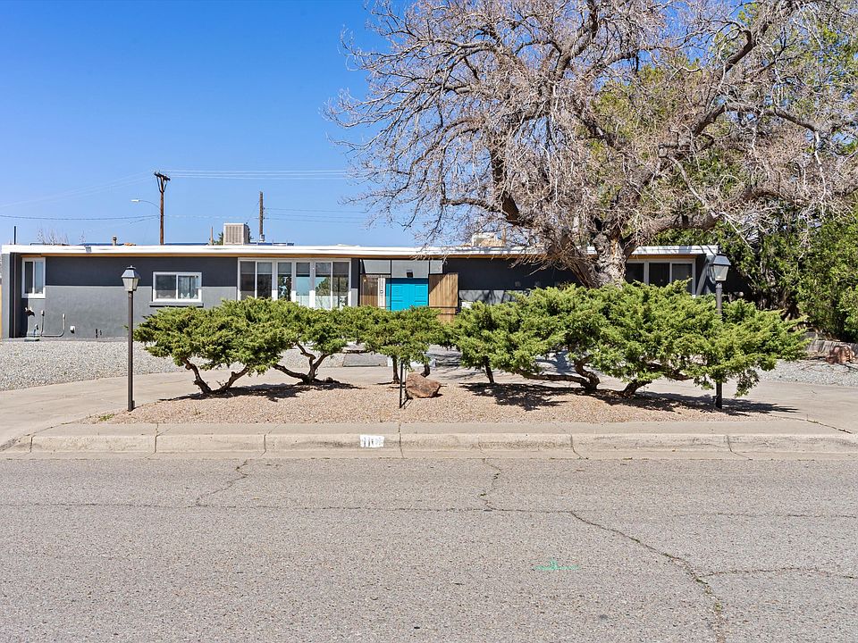 Welcome to this stunning midcentury modern home designed by renowned New Mexican architect, Max Flatow. Located in the coveted Spruce Park Neighborhood, this house is minutes from UNM, UNMH, and numerous parks and restaurants.As you enter the house, you are greeted by an open floor plan with a 40-foot-long window wall that provides breathtaking Sandia Mountain views while illuminating the home with natural light. The house has been renovated, featuring a new kitchen, bathrooms, appliances, stucco, porcelain tiling throughout, covered patio, and desert landscaping. Additionally, the utilities have been updated with a solar panel array and a ductless heat pump for efficient heating and cooling. This home offers the perfect blend of modern amenities and historic charm.