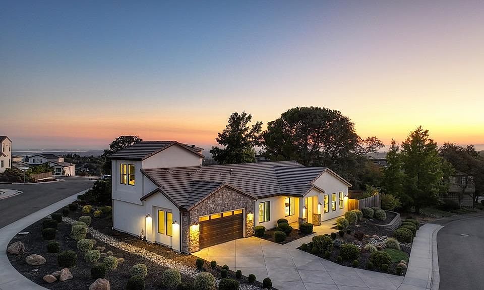 Welcome home to 1101 Sluice Box Circle! Built in 2018, this meticulously maintained 4-bedroom, 3-bathroom home offers 2,461 square feet of spacious living. The single-story layout includes an upstairs loft with stunning views of Folsom Lake and the rolling hills beyond. As you enter, you're greeted by an open floor plan, high-end finishes, and an exquisitely landscaped backyard featuring a serene waterfall and electric patio awning. Soaring ceilings, recessed lighting, and imperfect smooth-textured walls create a modern and inviting atmosphere. The home is equipped with electric roller shades for added comfort and convenience. The living room, complete with a cozy fireplace, includes an LG TV. The chef's kitchen offers dual sinks, a pot filler, glass upper cabinets, and a large island perfect for entertaining. The primary suite include outdoor access, a luxurious en-suite bathroom with dual vanities, and a spacious walk-in closet. Thoughtful touches like brushed nickel hardware throughout the home add to its elegance. Additional highlights include a Generac generator, included backyard shed, epoxy-coated garage floors, and a fully equipped laundry room with included washer, dryer, sink, and ample cabinetry. Don't miss the chance to make this exceptional home yours.