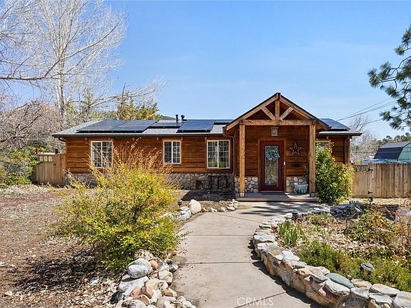 STUNNING PINON PINES ESTATES HOME WITH STUDIO, SOLAR PANELS, AND TESLA CHARGING STATION; Welcome to this stunning Pinon Pines Estates home, nestled on a sprawling 14,253 square foot lot. This property includes a main house with 2 bedrooms, 2 bathrooms, and a separate studio apartment with its own bathroom. Access is available either Snowline Drive or Snowbird Drive, both bordered with wrought iron gates. The circular driveway is made of beautiful brick cobblestone pavers and is conveniently equipped with a Tesla charging station. This residence is also equipped with solar panels, a mini-split system installed in three rooms, and a new roof. Inside, the floors are beautifully finished with tile wood planks, complemented by a custom wood accent wall in the dining area. The kitchen is a true highlight, featuring a tile backsplash, sleek quartz countertops, and top-of-the-line GE Chef’s appliances. The open and airy floor plan provides seamless flow between the living spaces, making it ideal for both relaxed everyday living and entertaining guests. The cozy bedrooms offer plenty of natural light and closet space. The bathrooms are thoughtfully designed with modern finishes, and there is also a separate laundry room. Step outside to relax in the built-in jacuzzi, which comes with its own dedicated storage house. The expansive outdoor space is perfect for entertaining, with plenty of room for pets to roam. Additional features include a two-car garage with paved access and RV parking. This home offers a perfect blend of comfort and thoughtful design, making it an ideal retreat in the highly desirable Pinon Pines Estates. Don’t miss out on this incredible property, call today before it’s gone!