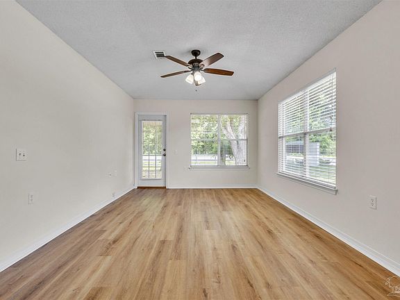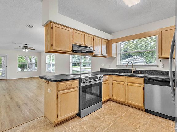 This adorable 3-bedroom, 2-bathroom home offers both comfort and convenience in a thoughtfully designed layout. The spacious kitchen features stainless steel appliances, a breakfast bar, and a clear view into the open-concept dining and living areas, perfect for entertaining or everyday living. The master suite includes elegant tray ceilings, a double vanity, a linen closet, and a large walk-in closet for ample storage. Durable laminate wood flooring runs throughout the main living areas, while matching tile enhances the bathrooms and laundry room. Enjoy easy living in this move-in ready cottage located in a desirable, accessible neighborhood.