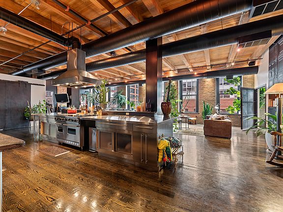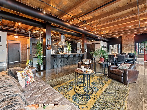 This sprawling, exquisite timber and exposed brick 4 bed/3 bath loft in the sought-after Fulton Market/West Loop neighborhood is an entertainer's dream. Featuring 14ft ceilings, natural hardwood floors, and grandiose original steel doors throughout. The centerpiece is a restaurant-grade stainless-steel chef's kitchen with an industrial range and double oven, two-drawer dishwasher, concrete slab countertop and bar, and walk-in pantry and wet bar. The kitchen overlooks an open-concept living/dining area with nearly 50ft of window line bringing in tons of natural light. The expansive primary bedroom and en suite bathroom features luxurious modern finishes, including an oversized steam shower enclosure, quartz double vanity, freestanding spa bathtub, and heated flooring. The second bedroom shares access to the primary bathroom and could be used as a den or study. The third and fourth bedrooms balance the floor plan on the south side of the home with a jack-and-jill full bathroom with shower/tub. The fourth bedroom is currently configured as a home office/family room with custom built-in Brazilian quartzite desk, 11ft TV projector screen and entertainment system, and gas fireplace. Unit also offers a third full guest bathroom and laundry room with side-by-side washer and dryer. An enclosed brick patio offers a rare private indoor/outdoor space with custom sliding doors, windows, and blinds. Patio has direct access to the freight elevator. Smart home technology integrations like the Butterfly Entry System, and apps to control surround-sound speakers and TVs throughout the house, and two central heat/air units right from your phone. Unit is configured for Google Fiber internet. Indoor, heated garage includes one deeded parking space, with opportunity to take over lease of two additional spaces. Large common rooftop deck with shared BBQ, TV, and stunning skyline views. Conveniently located two blocks from the Morgan el stop provides easy access to downtown, and is mere steps from "Restaurant Row", boutique shopping, dynamic nightlife, and within the Skinner school district. Truly a one-of-a-kind masterpiece in one of Chicago's most popular neighborhoods.