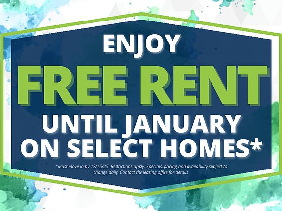 - Special offer! Enjoy FREE rent until January 2025 on select home! *Must move in by 12/15/25. Restrictions apply. Specials, pricing and availability subject to change daily. Contact the leasing office for details.