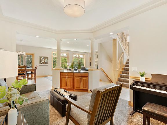 This stunning two-story custom-built home, nestled on a picturesque .86-acre wooded lot overlooking a serene pond, is located in one of Champlin’s most sought-after neighborhoods. As you enter, you’re greeted by a grand two-story foyer that opens to a formal dining room or sitting area featuring a tray vaulted ceiling and an elegant built-in cherry buffet. The expansive great room boasts a cozy gas fireplace, custom built-ins, and a wall of windows that offer breathtaking views of the pond and lush, wooded backyard.