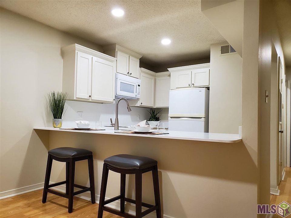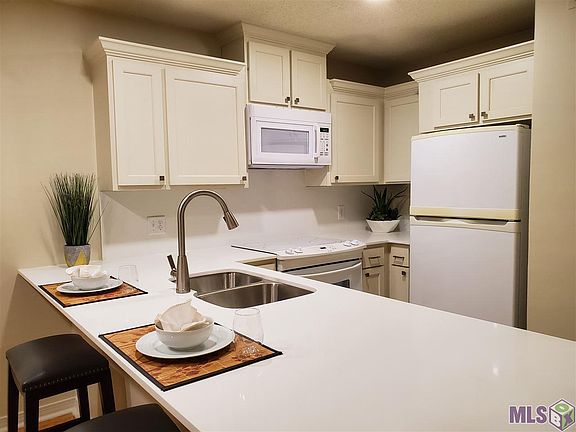 Renovated ground floor unit. 1 Bedroom/1 Bath. Kitchen opens to breakfast area with breakfast bar. Quartz countertops in kitchen and bathroom. New plumbing fixtures and cabinetry. Laminate wood floors and ceramic tile. Fresh paint. Recessed lighting. Ceiling fans in living and bedroom. Fireplace in living room. Bathroom has 6' soaking tub with shower. Patio Area. Washer, dryer, and refrigerator included. Water, trash, and sewer included in rent. Bayou Rouge offers covered parking, manicured landscaping, club house, and pool. Conveniently located at Jefferson Hwy and Airline. Just moments from Town Center, Mall of LA, and Perkins Rowe. Easy access to LA I-10 and I-12.