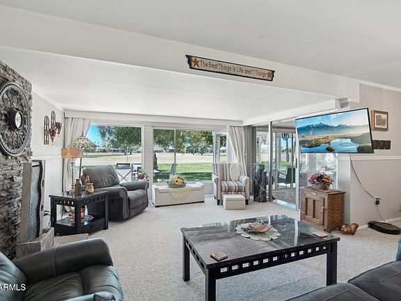 This Charming 2 Bedroom 2 bath spacious Sun City Condo has a great view of the 16th hole of Sun City South Golf Course! You'll love all the updates the Sellers have done! Kitchen updated in 2024 with Quartz Counters,Tile Backsplash, recent Appliances and a pass through breakfast bar opening to the large, open Great Room with big picture windows that give a fantastic Golf Course View! 1366 square feet includes the Arizona Room with Free-standing Electric Fireplace.There is also a Tiled screened patio plus an outside patio with big shade trees and green grass to enjoy watching the Golfers! Extended 1 Car Garage has room for a Car plus a Golf Cart parked sideways. Updated Laundry Room has Cabinets and Elfa Workbench with Tool Storage. Sun City is the original FUN City, a 55+ community with 7 Rec Centers, 8 Golf Courses, 27 Pickleball Courts, 10 Tennis Courts, 2 Bowling facilities, and much more. HOA includes water, lawn maintenance, outside painting and roof, and allows Rentals and Pets!
