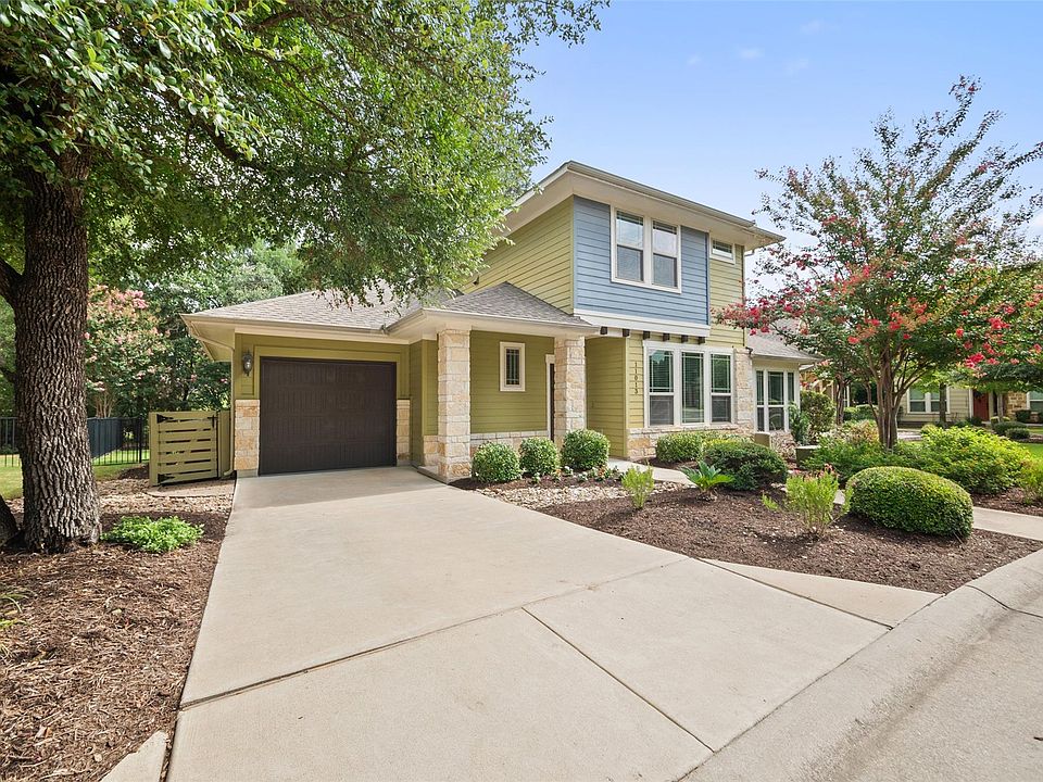 Nestled behind the gates of the Cottages @ Northwoods in Avery Ranch, this former model home occupies one of the community’s most tranquil and desirable greenbelt lots. Positioned at the front of the neighborhood, it balances privacy with peaceful views. Homes in this coveted section are rarely available, and pride of ownership is clear throughout. The HOA maintains the yard year-round, including four-season treatments, creating a beautifully landscaped, low-maintenance outdoor setting that blends seamlessly with the greenbelt. Inside, natural light, soaring ceilings, and impeccable finishes create a true model-home feel. High-end touches include wood floors, stone countertops, stainless appliances, wood cabinetry, and even a pet-suite in the utility room—hallmarks of a builder’s showcase property. The main-floor primary suite sits at the rear with serene greenbelt views, a large walk-in closet, and a spacious shower. Upstairs, two additional bedrooms and a full bath provide flexibility for guests or a home office. The private backyard backs directly to the protected greenbelt with no rear neighbors, perfect for morning coffee, evening relaxation, or entertaining. Residents enjoy the community pool, amenity center, Brushy Creek Hike & Bike Trail, and nearby Metro Rail for easy recreation and commuting. Served by acclaimed Round Rock ISD, this home blends thoughtful design, a premier lot, and an exceptional Avery Ranch location.