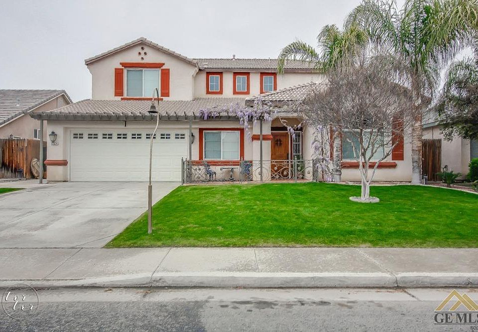The moment you set eyes on this 5 bedroom, 3 bath you will feel right at home and know you have found the one! From the inviting courtyard entry to the updated wood floors and unique tiled staircase you truly will fall in love at first sight. This gorgeous home offers a formal living/dining, kitchen with features that include granite countertops, granite island with cabinets, white appliances, walk-in pantry, large breakfast bar overlooking the family room and making it perfect for entertaining guests. The spacious master suite offers 2 walk-in closets, master bath with 2 sinks, separate shower and a relaxing soaking tub. The backyard offers a large covered patio, gated inground swimming pool perfect for those hot Bakersfield summers, and a large yard to play or entertain.