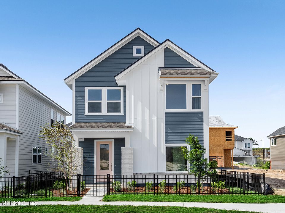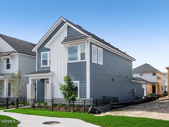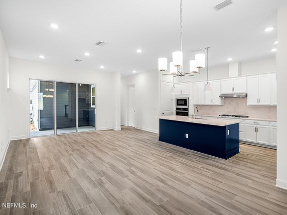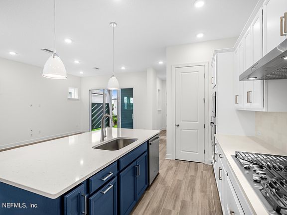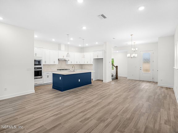 The Westberry's first level is made for entertaining. The large kitchen island overlooks the main living space, keeping everyone included.The beautiful navy kitchen island accent cabinets add a beautiful and unique feature to your new home. The white perimeter cabinets and light quartz countertops keep the space light and bright. Large sliding glass doors from the family room lead out on to the covered lanai, perfect for getting some shade from the hot sun. The open stair railing and window placement above the stairs make this an inviting space full of natural light. The second floor your new home houses the private living spaces. The owner's retreat includes trey ceiling and a private bath complete with navy and white design features. Granville is a gated, natural gas neighborhood conveniently located next to the eTown Exchange.