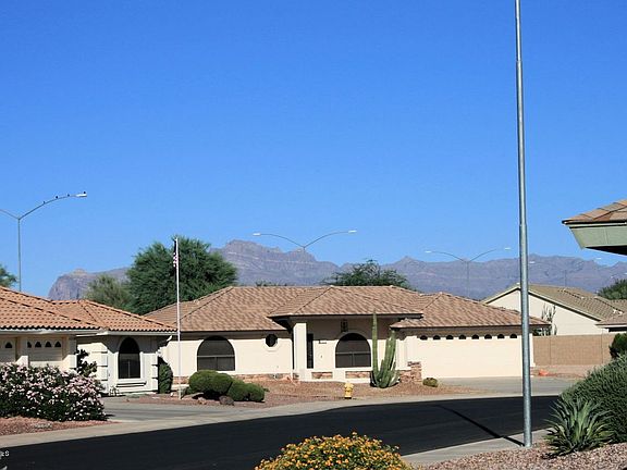 Beautifully UPGRADED home w/view of Superstition Mountains from large, tiled front patio. 2 bedrooms/2 baths with a den-split floorplan. 18'' procelain tile in all areas but bedrooms & den. Silestone kitchen counters, R/O and Softwater Systems. Master bath features separate garden tub and shower & high-rise stool. Built-in desk and shelves in den. 2 Security Doors, South facing back patio, Security System and attached cabinets in garage. Exterior and interior of home repainted in 2009. Community features the following: 27 hole Golf Course, Tennis courts, Swimming Pools & Heated Spa. 13,000 sq. ft. Auditorium, Fitness Center, Wood Shop, Lapidary, Softball Field, Shuffleboard, Bocce Ball & Pickle Ball. Convenient access to 60 and 202 Fwys, shopping, entertainment and medical facilities.