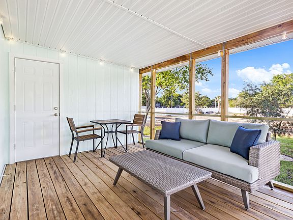 Rent includes electric, Internet, garbage, parking, water, sewer, landscaping, private screened porch with extra storage, and on-site maintenance. Super energy efficient and eco-friendly, this all-electric Tiny House with a large screened porch is turnkey and has first floor living with a Queen bed, functional kitchen with washer/dryer combo, and full size bathroom. The kitchen is designed with stone countertops, an induction cooktop with a venting hood, a tall fridge over freezer, and a versatile double flip table for work or dining. The bathroom has a Toto toilet with mirror, shelving, and a full-size shower. Living area features a Smart TV, USB outlets and a couch for lounging, as well as a closet for storage. You'll also stay comfortable thanks to the fully climate-controlled interior, which includes a High Efficiency A/C heat pump. This thoughtfully designed unit features lots of windows for natural light and airflow, paired with light-toned, natural materials and smart, space-saving features creating a cozy, functional, and uniquely inviting home.