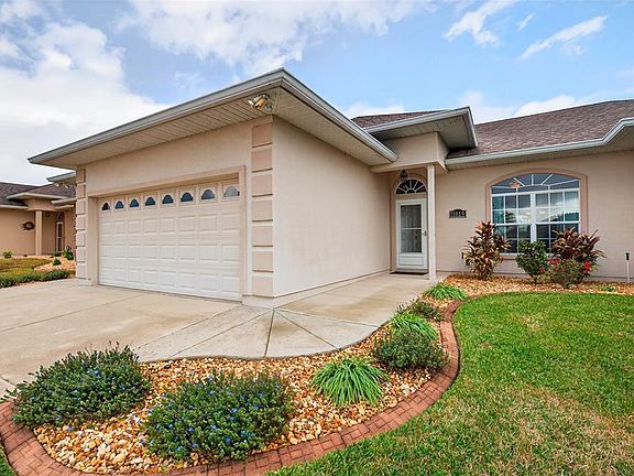 A Lot of Bang for the buck in Gated, Stonecrest a 55+ community with plenty of amenities, a low $148/ month hoa and a stone throw away from The Villages! Stonecrest is a 55+ gated golf course community with all the amenities, 3 outdoor pools and 1 indoor pool, pickleball courts, softball, 18 hole championship golf course, Broad Stripes Golf & Social Club and over 80 different clubs to join! Stonecrest is just a bridge away by golf cart to the Villages. It is a community with Private Roads and 24 Hour Security! This Lily model is the perfect blend of well maintained and low maintenance living featuring new lift master garage door opener, 2 car garage plus 1 golf cart garage ready for those golf cart adventures. Step inside this beautiful, move in ready, open floor plan to spacious living room with tile floors and 10 ft ceilings, to a warm inviting place to call home forever or home for the winter in the sunshine state! The living rooms flows seamlessly into the dining room and kitchen with pass thru window charm. The kitchen has solid oak cabinetry, 2024 stainless steel appliances, pantry and perfect position eat in area with picturesque window overlooking the backyard. Put a bird feeder outside the window and enjoy the cardinals and others feeding! Behind the kitchen is the private primary bedroom for your getaway when guests are here. The primary bathroom has double vanities, floor to ceiling surround tile, easy walk in shower with glass surround wall and glass door. Stepping back across home through main living area are the 2 additional bedrooms and 2nd bathroom with vanity, and combo tub with shower with tile to the ceiling. Stepping through the dining room you are greeted with a double slider out to enclosed, and covered Florida room with views of spacious backyard. 2022 Hvac. Rain Gutters and irrigation system. Garage has entry door for easy access. All this in Stonecrest close to the villages lifestyle at a fraction of the price!! With close access to enjoy all this area includes!!