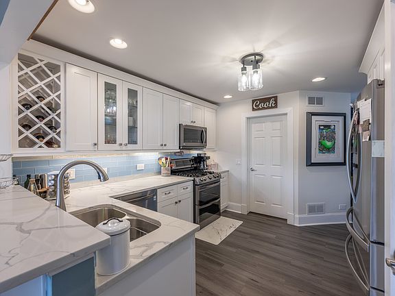 Cozy fireplaceSpacious pantryBright and modern kitchenQuartz countertopsBreakfast barStainless steel appliancesTile backsplash
