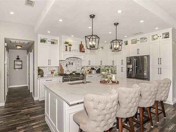 Santa came early with a special gift just for you. This home boasts both beauty and simplicity appealing to the most discriminating buyer. The kitchen was designed specifically with the chef in mind with finishes ever pleasing to the eye. The commercial gas range and oven has a pot filler, a custom hood and is flanked by a backsplash of real brick with a german smear finish. The quartz island is 9ft x 5.5 ft, no seams, one solid slab, the cabinets are wood featuring mullions to showcase your decor, there are pullouts and soft close doors and a hidden microwave for saving space. From the living room open the pocket sliders and enjoy your extended, pavered lanai, with an outdoor shower. This is a wonderful space for lounging and in the evenings a fire pit is the perfect finish to the day. Your main bedroom is spacious and has access to the lanai and pool. There is a dedicated office, so working from home will be a comfort here and it can also be used as a fourth bedroom if needed. Don't delay, call today for your private viewing.