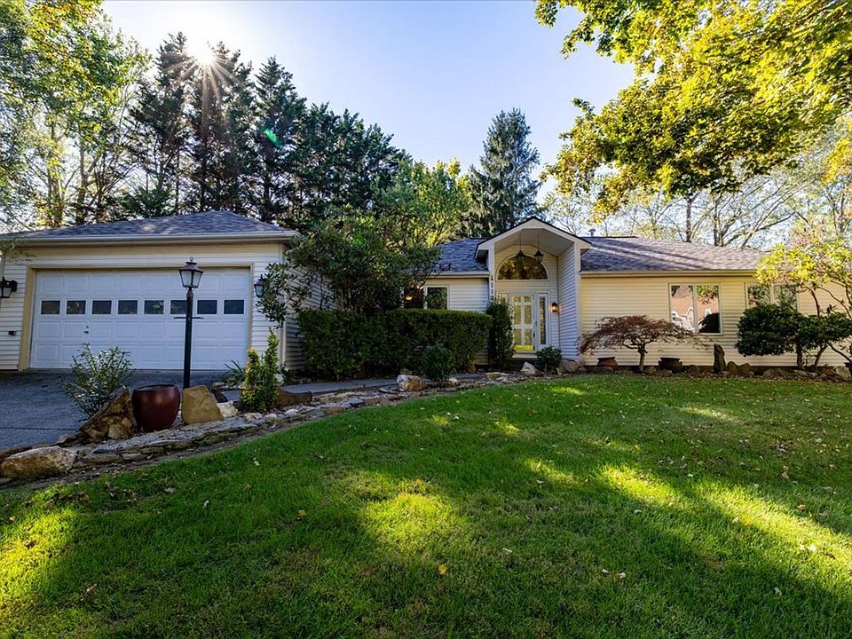 This freshly painted 3-bedroom, 2-bath home blends warmth and light. The earth-tone palette sets a cozy backdrop for the walls of glass that surround much of the house, while skylights brighten the soaring family room. A sunroom off the kitchen offers year-round views and a perfect spot for coffee, plants, or evening wine. With a new roof, spacious 2-car garage, central A/C, gas heat and hot water, plus all major appliances (washer/dryer, refrigerator, stove, dishwasher), the home is both stylish and practical. Pets welcome. Ideal for graduate students, professionals, or families seeking a quiet neighborhood. No undergrads. Residents cover utilities, lawn, and snow. Built in 1991. Located in Meadow Run HOA.