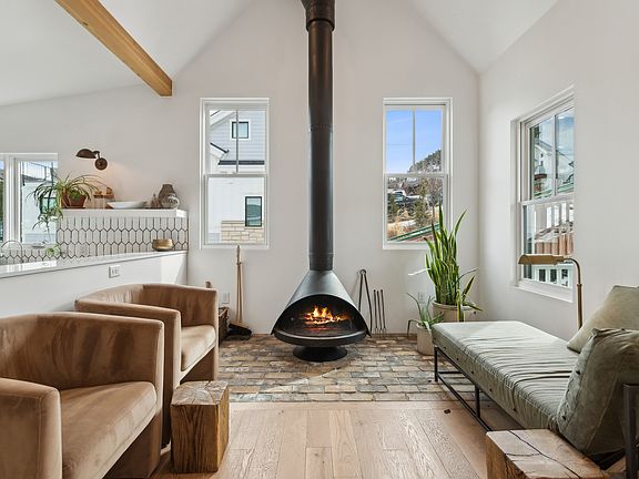 A welcoming great room anchors the home, featuring soaring ceilings, a malm fireplace, and expansive windows that frame the beauty of Historic Old Town. The adjoining chef's kitchen is fully outfitted with premium appliances and a generous island, perfect for casual mornings or hosting friends after a day on the slopes.