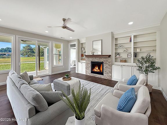 New construction with golf course views! Luxury living just minutes outside historic downtown Edenton with easy access to the Outer Banks of North Carolina. The open concept floor plan features bright airy living area with a fireplace and custom built-ins, a kitchen with granite counters, a breakfast bar, a dining area, and a formal dining room. Recessed and designer lighting add modern style in every space. The split floor plan highlights a private primary suite with two closets, dual vanities, a freestanding soaking tub, and a spacious shower. The suite also includes direct access to the covered porch overlooking the golf course. Luxury vinyl plank flooring runs throughout for both style and durability. From the wide-open flow to the unbeatable setting, this brand-new home.