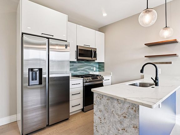 This specific offering is a spacious, two-bedroom, one-bathroom corner home. The unit features designer finishes, gas cooking, and hardwood flooring throughout, along with a washer and dryer located in a dedicated closet.