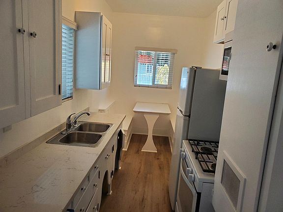 A 1-bedroom 1-bath 610sf upstairs apartment with newly remodeled bathroom, partially remodeled kitchen, new windows, and new laminate flooring throughout. Coin operated laundry room on site. Rent is $1500 per month with a $1500 deposit. Small pets (cat or small dog) are ok. Shared deck over garages for all tenants. Renter is responsible for all utilities. Initial lease is for 1-year that converts to month-to-month thereafter. No smoking is allowed in the units or laundry room, but is allowed elsewhere on the property. Street parking is limited, but there is currently a garage space available for vehicle parking only for an additional $200 per month.