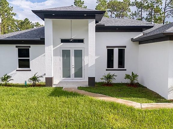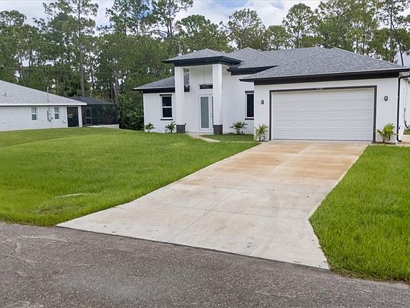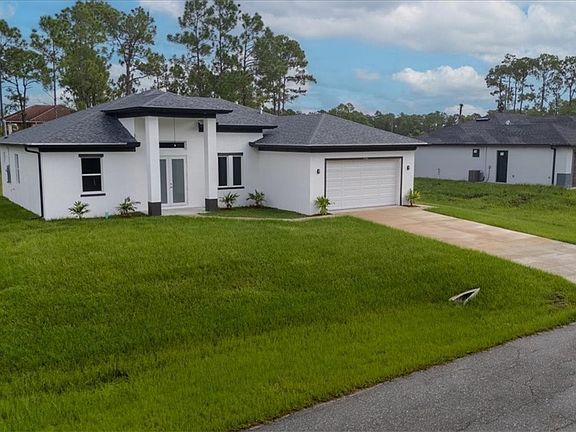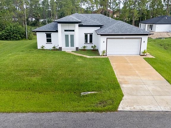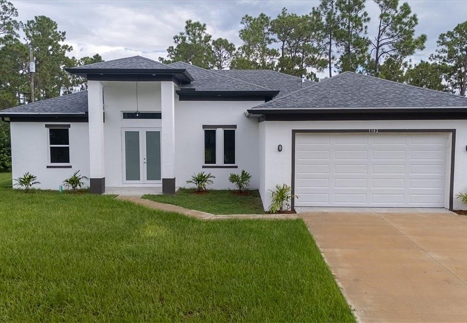 Step into contemporary elegance with this newly constructed 4-bedroom, 3-bathroom home, offering approximately 2,060 sq. ft. of beautifully designed living space. Located in the heart of Lehigh Acres, FL, this single-story gem combines modern luxury with spacious comfort—perfect for families or those seeking a serene retreat. This home features a sleek exterior with crisp white siding, bold black trim, and a contrasting gray roof. A clean driveway leads to a two-car garage, while a striking double-door entry sets the tone for what’s inside.