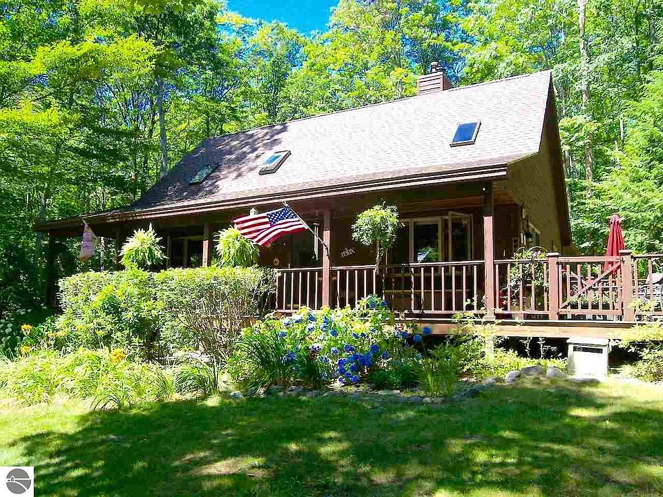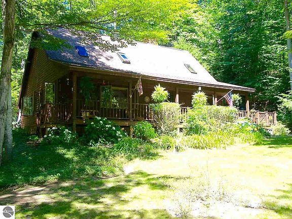 Come enjoy the Leelanau Life on quiet Hlavka (Lav-ka) Road, a winding scenic lane that plateaus in between Bohemian and Maple City Roads. This cottage style home is nicely situated on a rolling, hardwood forest, square 10 acre parcel. A welcoming south facing covered porch overlooks a sun washed yard where the birds converge and co-mingle with other resident wild life including barred owls, song birds, and other indigenous species. Soaring pine ceilings lit by skylights in the spacious living and dining room offer lots of natural light, cozy up to the natural cobble stone gas fire place, generous sized kitchen for the serious chef to cater to family, friends, and guests. Brand new stainless gas oven/range and side by side refrigerator as of May 23, new roof '16, freshly stained exterior so more time to play! Main level master suite, upper additional two bedrooms share an additional bathroom, full unfinished basement waiting for your finishing touches, with both conventional and wood forced air furnaces (separate entry off garage makes fire wood delivery a breeze) and back up generator assures you you won't be with out should there be any lapse in electric service (that never happens in northern Michigan!). Lake Michigan access via County Road 669/Bohemian Road is just minutes away and of course the Sleeping Bear Dunes National Lakeshore, the Sleeping Bear Heritage Bike Trail is scheduled to be extended to 669 this spring so you can bike to Empire thru Glen Arbor and back just a to the little north. New roof, cedar siding, paved driveway, all amongst wild and domestic plantings, are a magnificent natural accent in a splendid setting! Immediate possession.